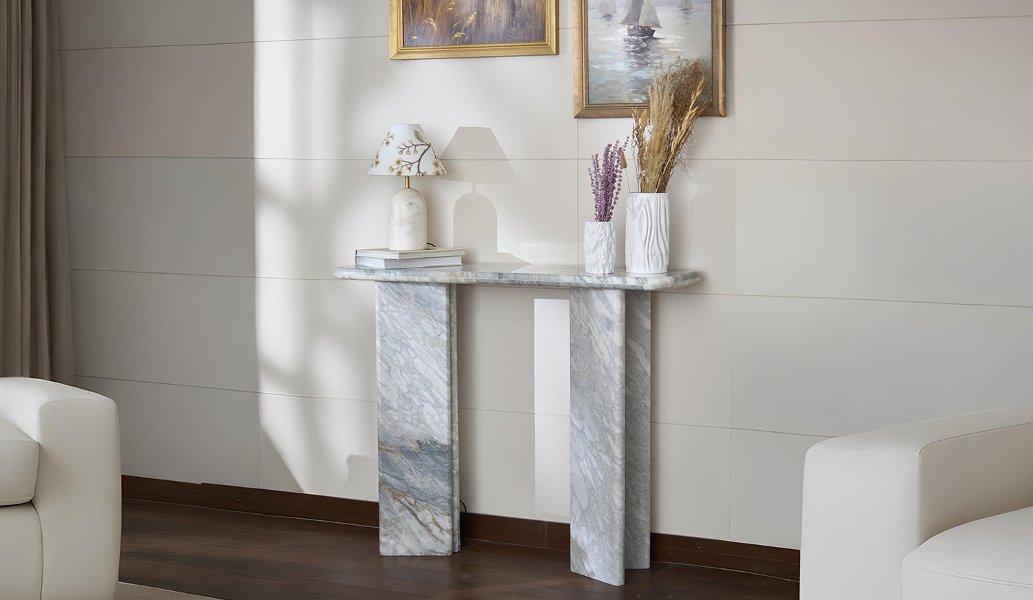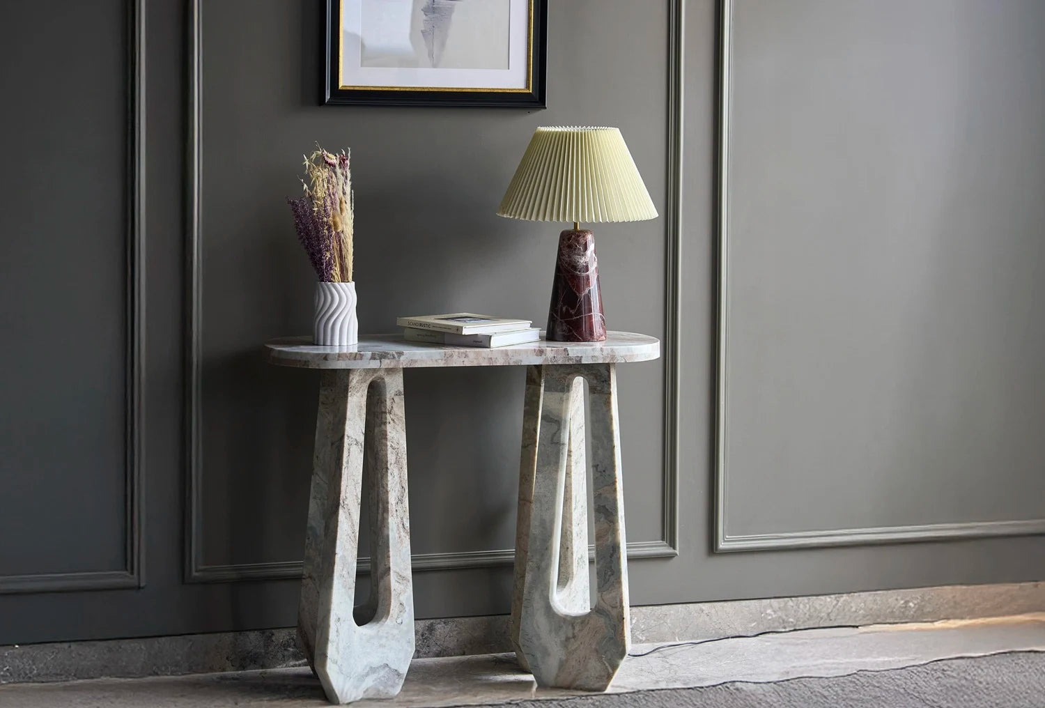 The ALDEN Console table exudes bold sophistication with its sculptural marble form....