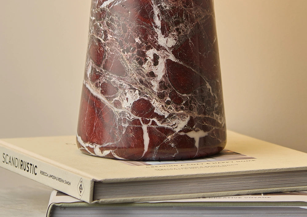 - Features a polished red marble base with distinct white veining.