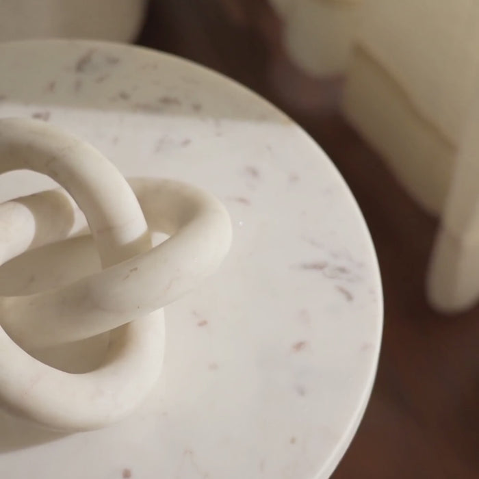 - Top and one leg in solid white marble with soft veining.