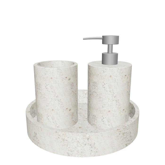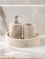 A thoughtful touch for your bathroom. This three-piece set includes a marble soap dispenser, tumbler, and tray, designed to keep your space tidy while adding a bit of everyday luxury. Made from natural marble, each piece has its own unique pattern and weight, bringing calm, beauty, and purpose to your routine.