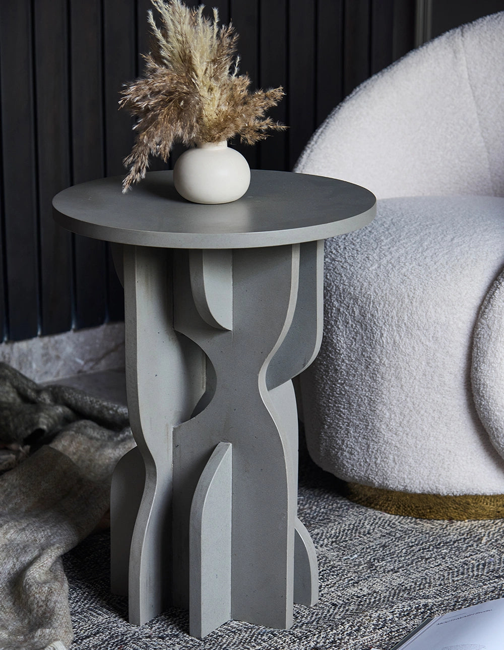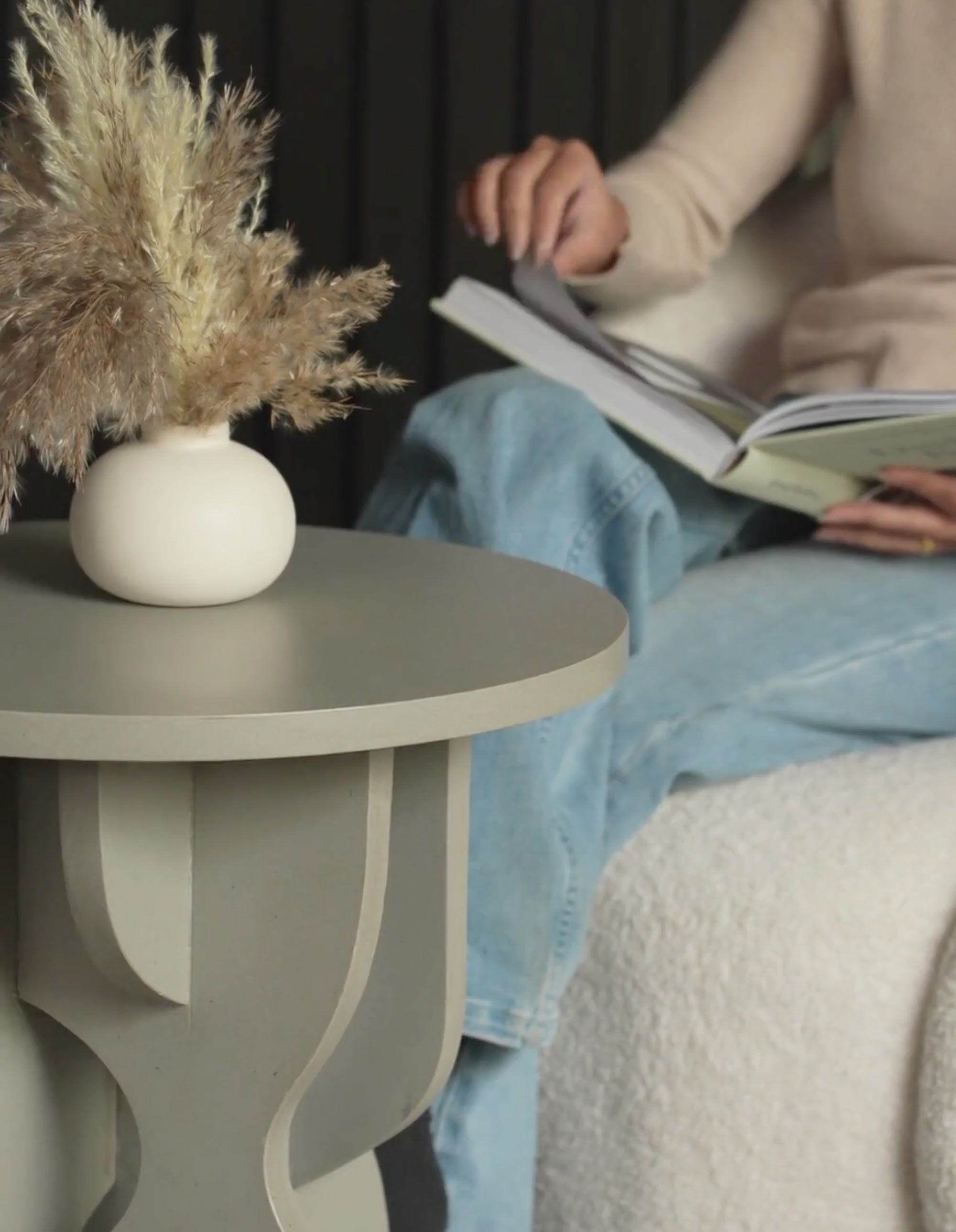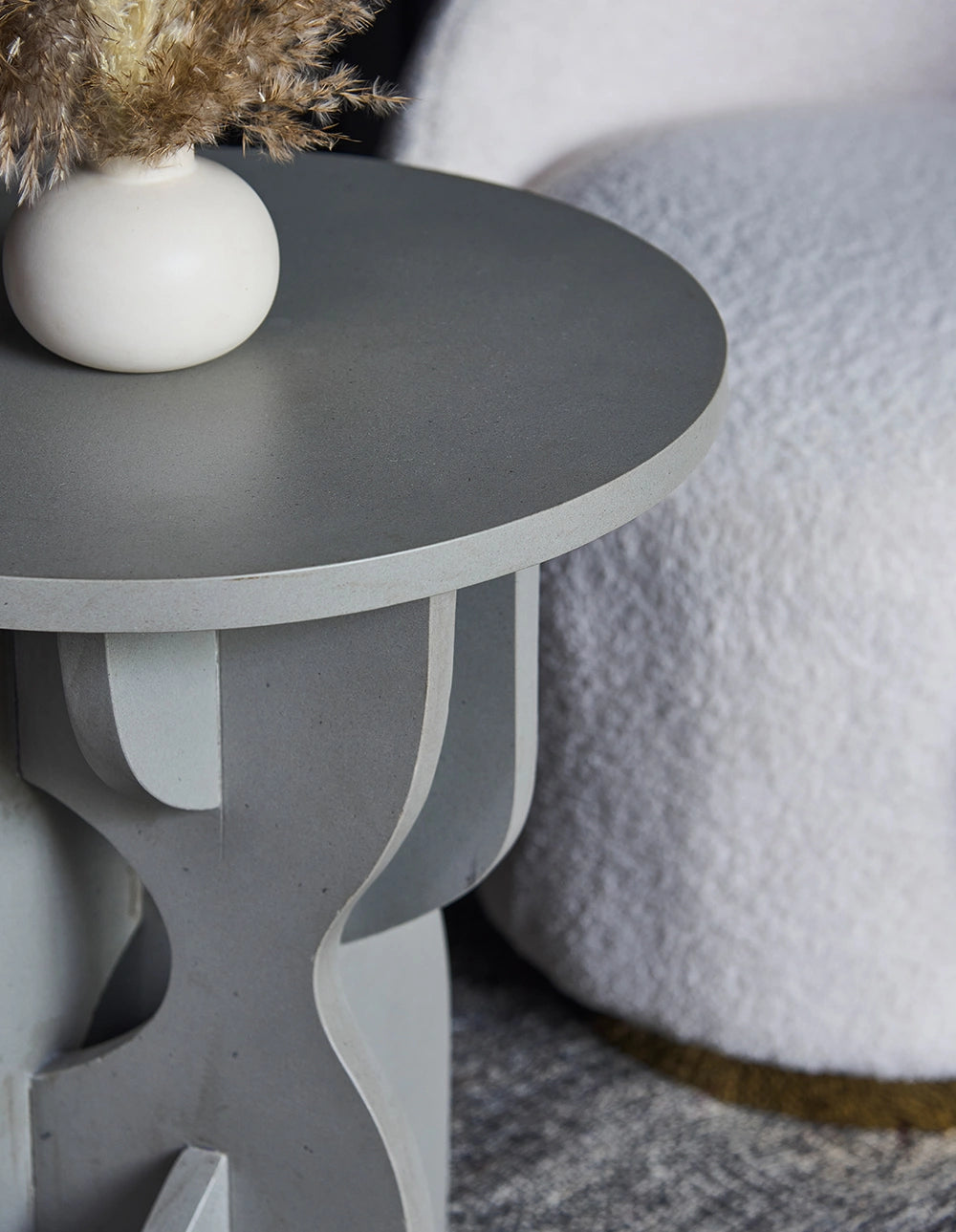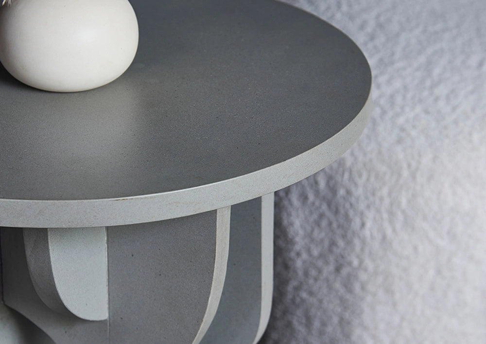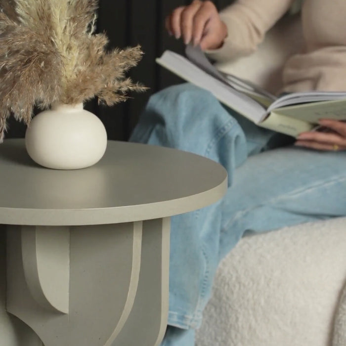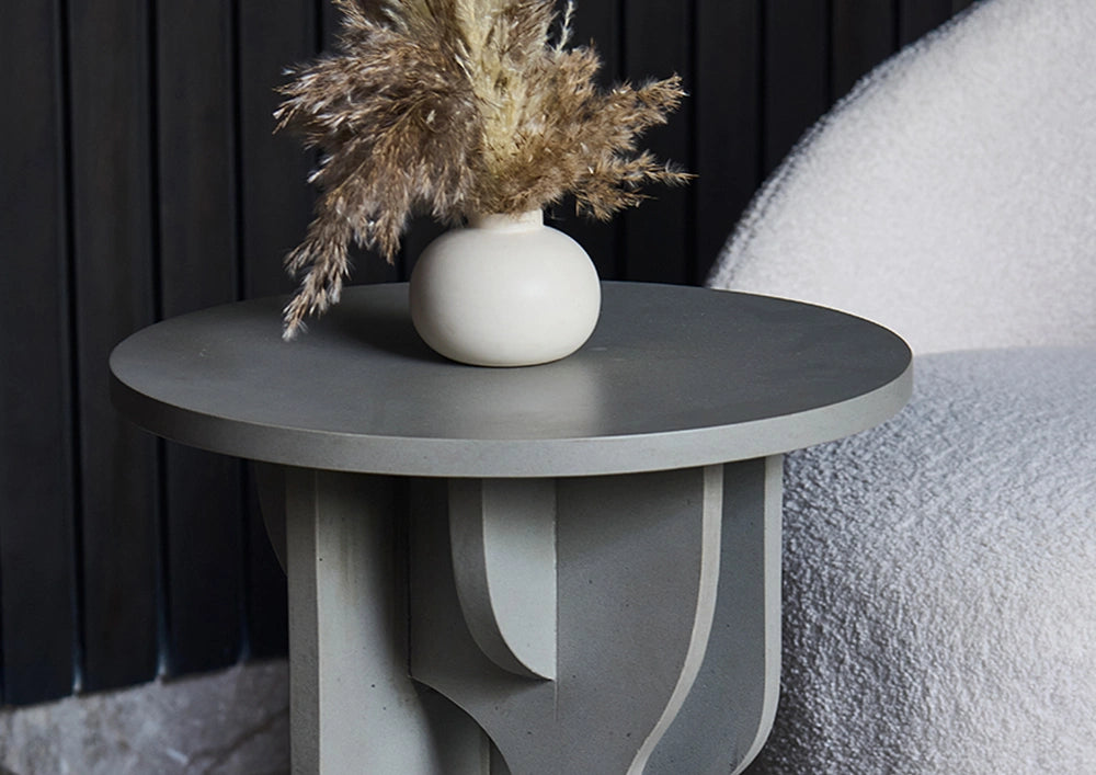 - Flat round top for styling, books, or drinks.