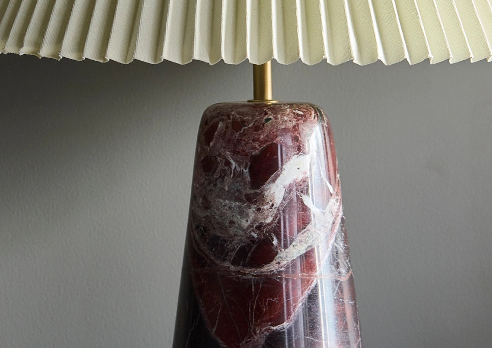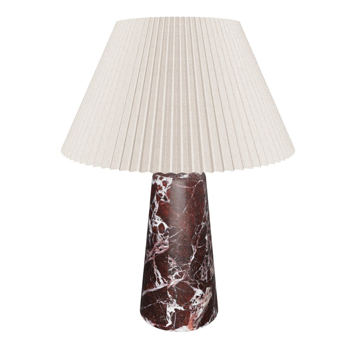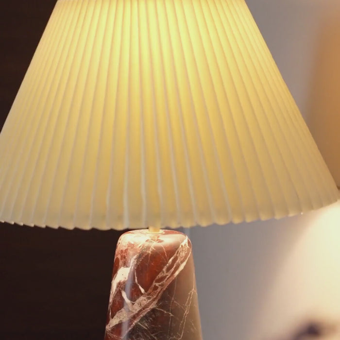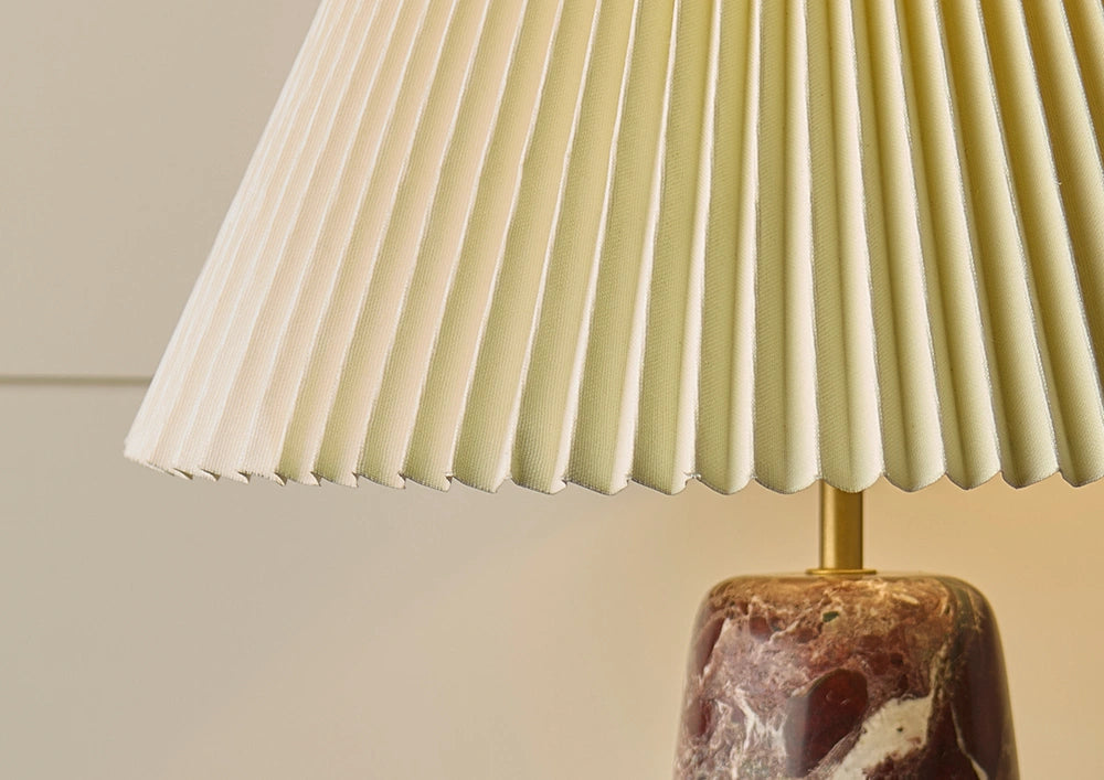 - Paired with a pleated fabric shade that casts a warm, ambient light.